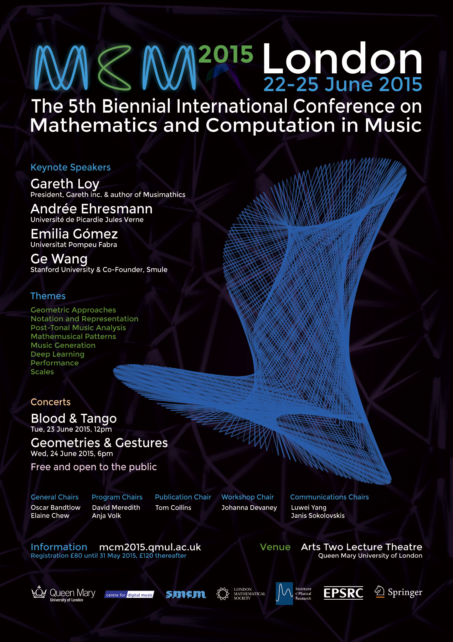 The Fifth Biennial International Conference on Mathematics and Computation in Music(MCM2015) will be held on 22-25 June-2015 at Queen Mary University of London in the United Kingdom.